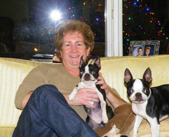 Bruce Turner house sitting Lily and Murphy, two Boston Terriers.
